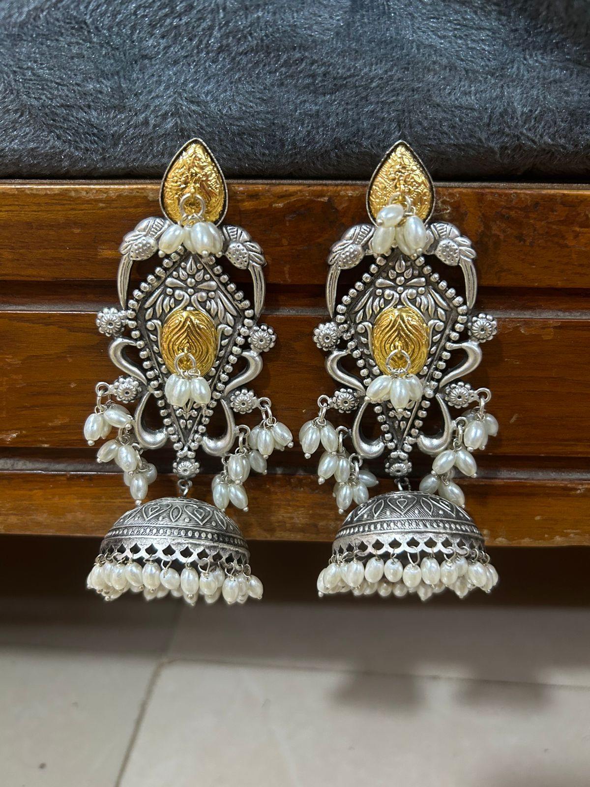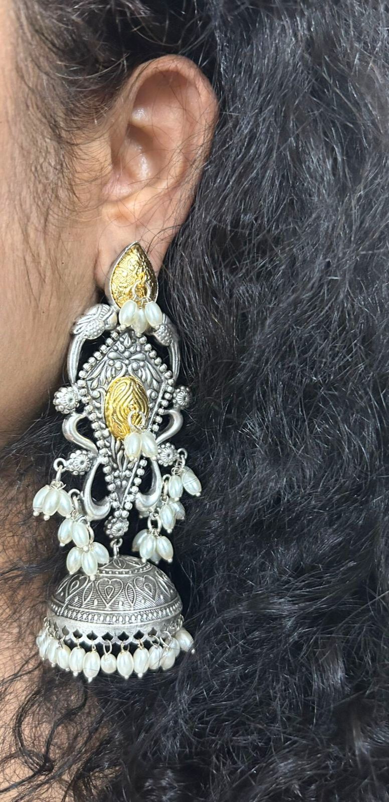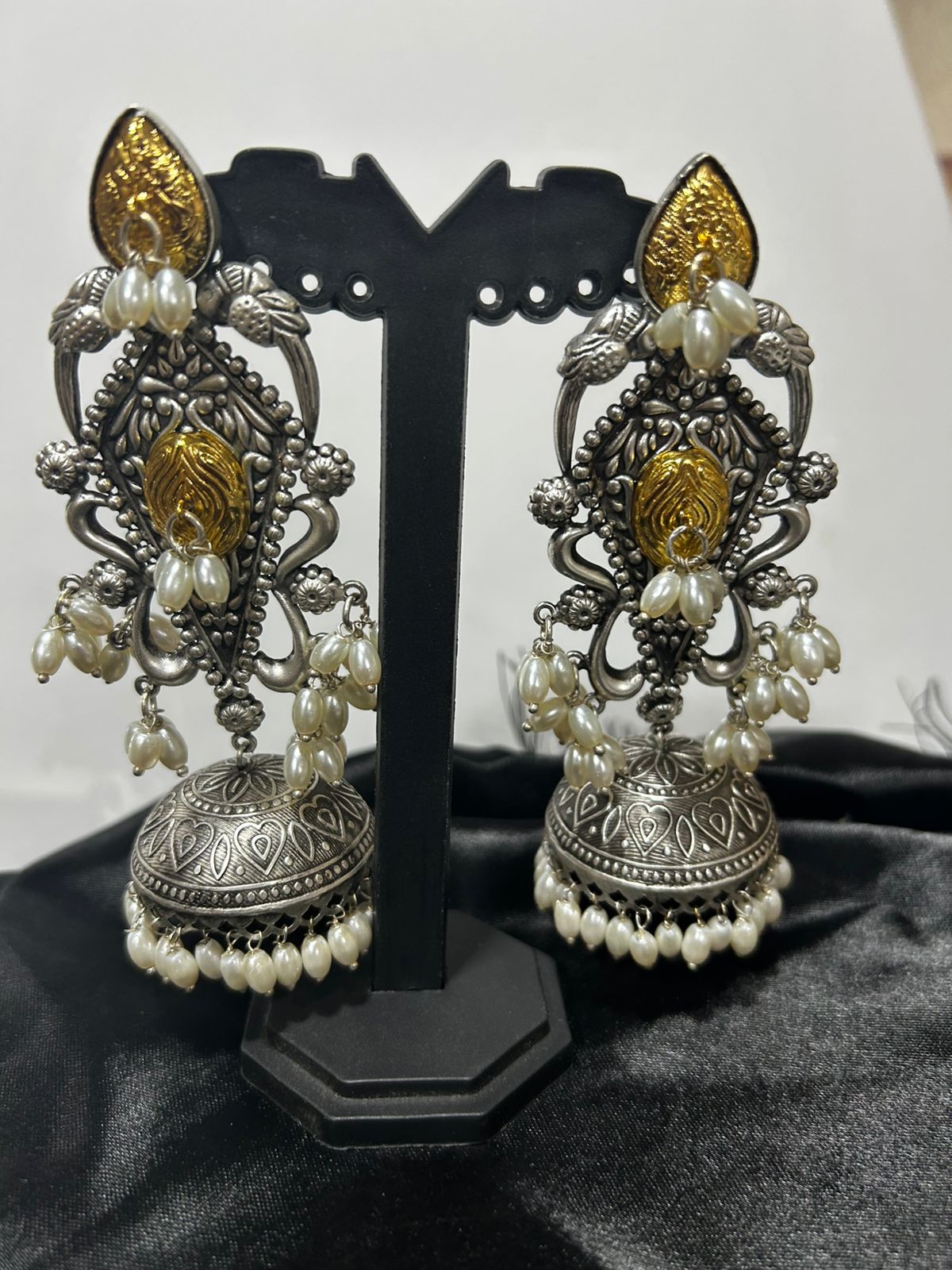 “Elegant oxidized silver jhumkas adorned with golden detailing and pearl drops — a timeless blend of vintage charm and royal sophistication.”