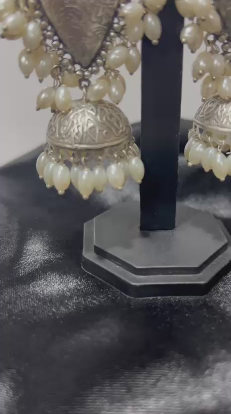 “Statement oxidized silver jhumkas with intricate golden detailing and elegant pearl drops — a perfect fusion of traditional artistry and royal allure.”